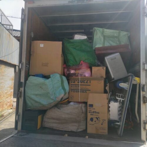 トラックを停める場所から家まで距離があり、搬出作業には特に時間と労力を要しました。回収した品物には、食器、本、衣類、書類のほか、マッサージチェアやダイニングテーブルなどの大型の不用品が多く含まれていました。